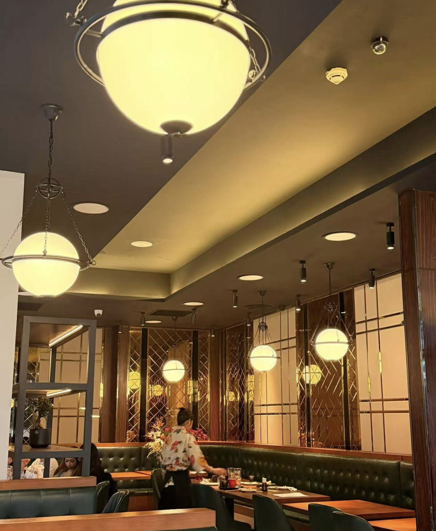 The dining room combines warm timber, deep green banquettes, and subtle metal detailing to create an atmosphere that feels both grounded and composed. Globe lighting casts a soft, even glow across the room, lending warmth without diminishing clarity.